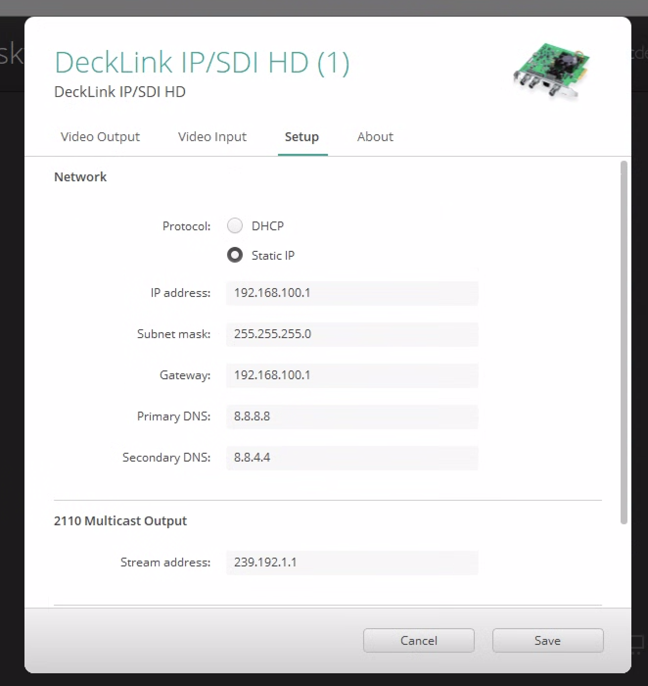 ## Example configuration for simple DeckLink IP HD card setup