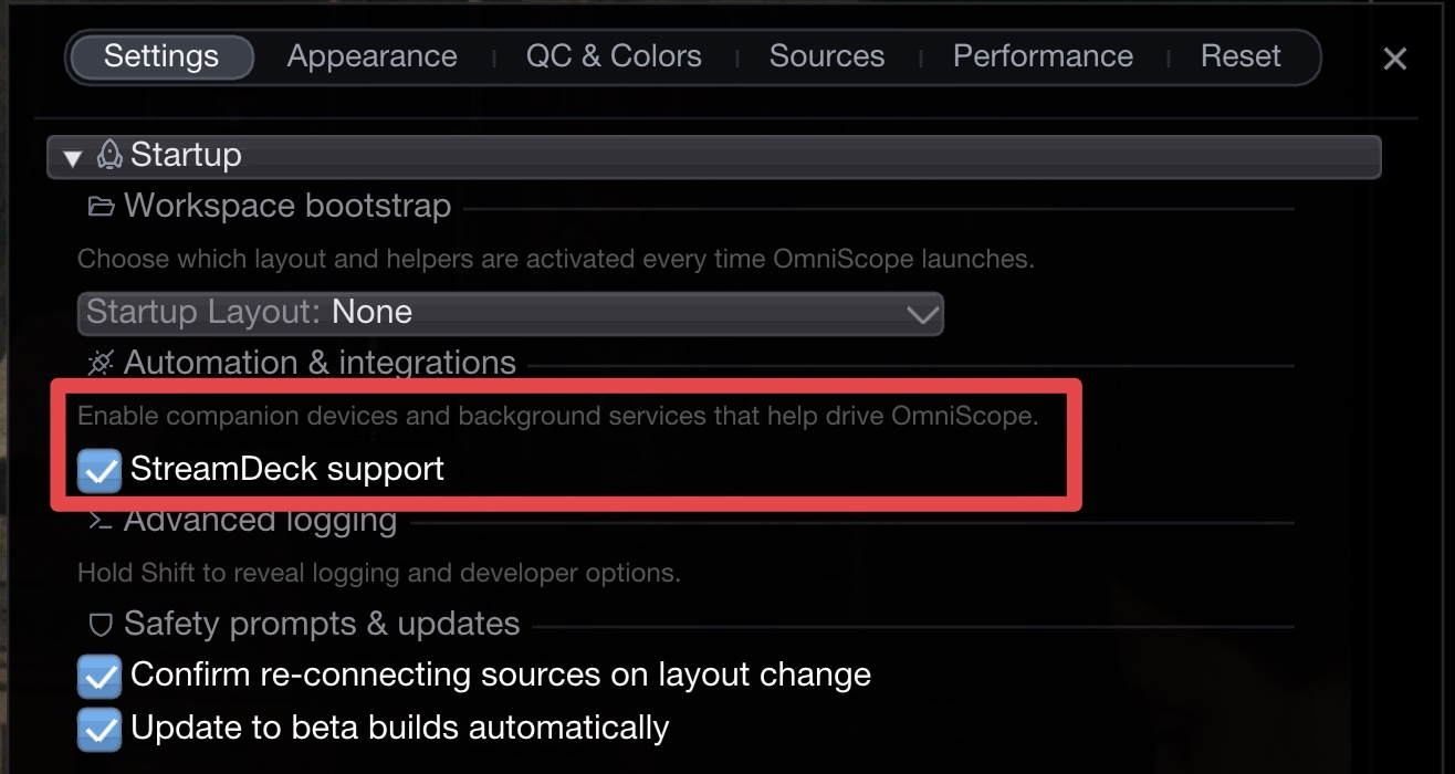 <figure><img src="https://565437294-files.gitbook.io/~/files/v0/b/gitbook-x-prod.appspot.com/o/spaces%2F-MFqn5MuayPgQPMZ9pwf%2Fuploads%2Fgit-blob-04c7063eb2b7dcaa2b66e0f66dc7ab9a3fd95f44%2F2026-02_streamdeck_config.jpg?alt=media" alt=""><figcaption><p>Enable StreamDeck support in Preferences</p></figcaption></figure>
