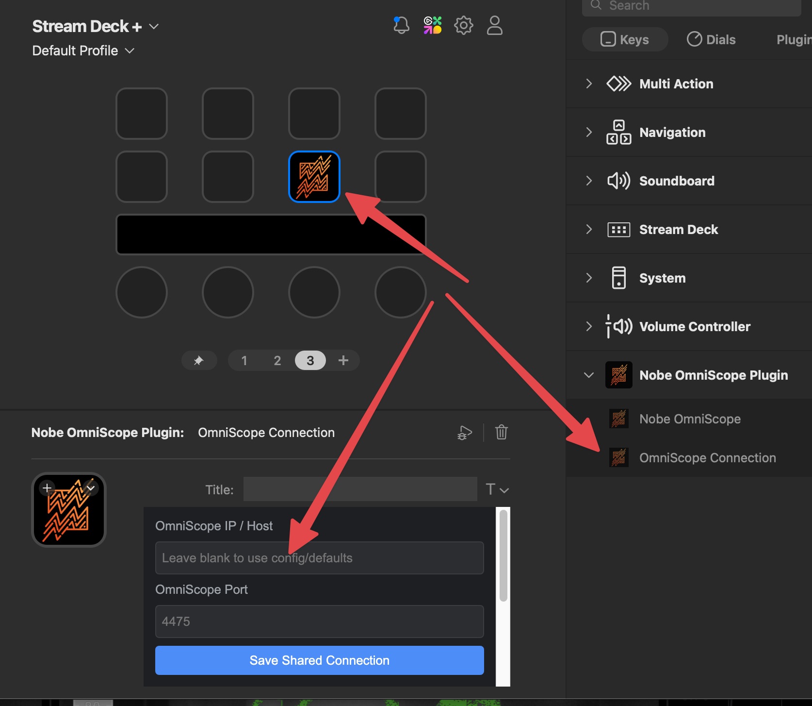 To configure the shared connection, drag the **OmniScope Connection** action onto any key, enter the OmniScope IP / Host and Port, then click **Save Shared Connection**.